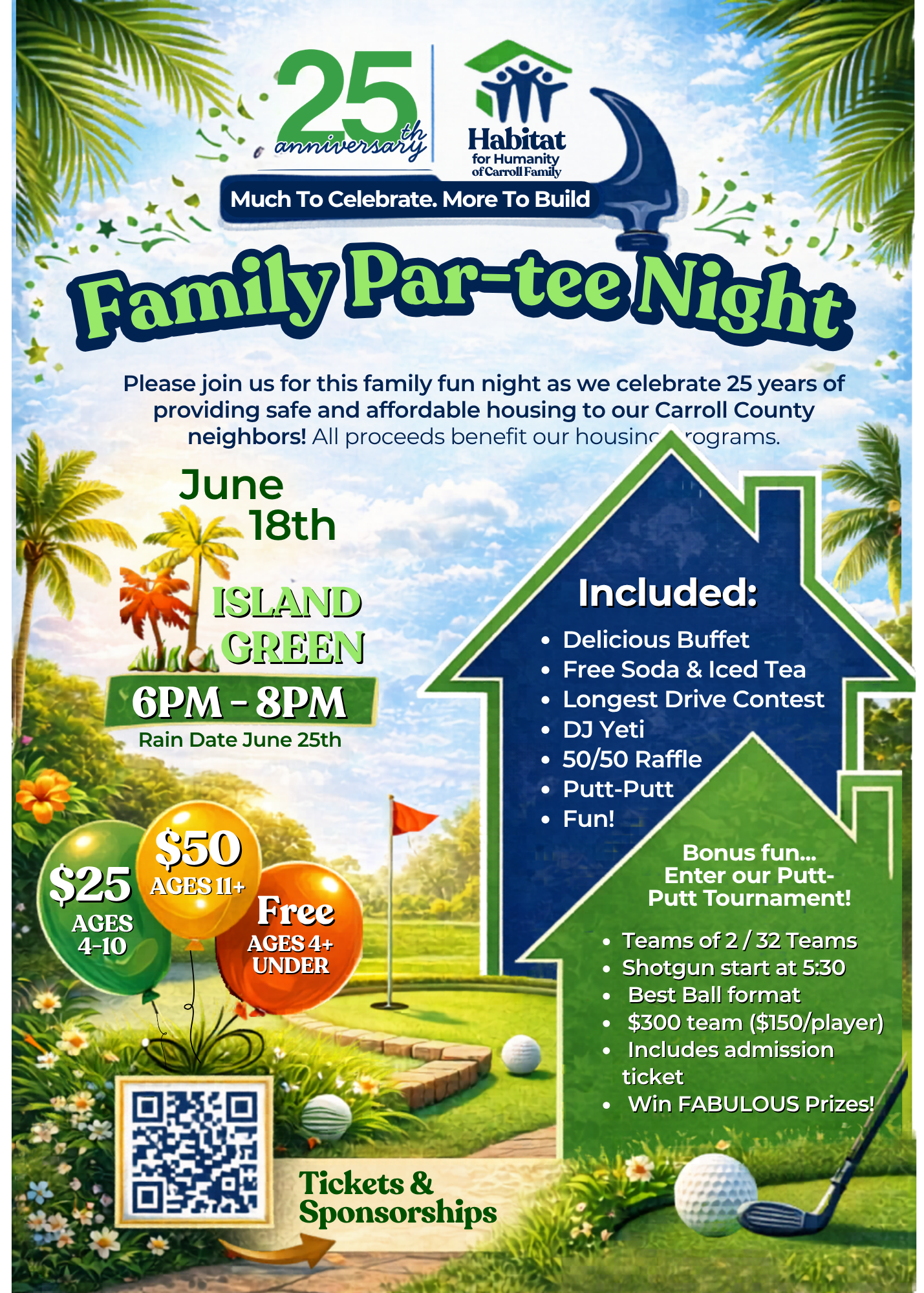 Join us as we celebrate the 25th Anniversary of Habitat for Humanity of Carroll County with a fun-filled evening at Island Green Family Fun Center!