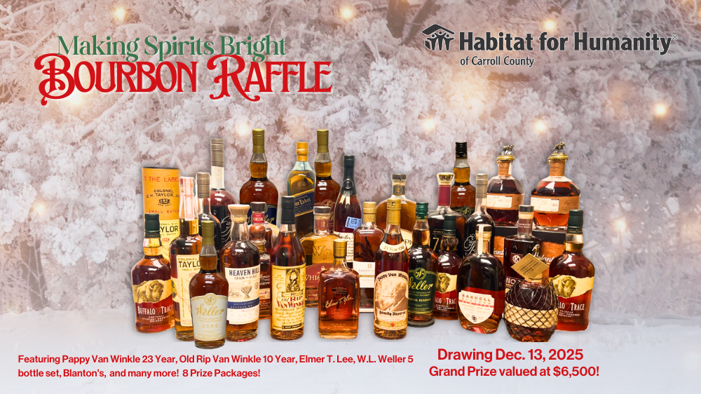 When you enter, you’re not just playing for a chance to win legendary bourbon — you’re also building brighter futures. Every ticket supports Habitat for Humanity of Carroll County’s Homeownership Program, helping families in our community achieve strength, stability, and self-reliance through affordable housing.